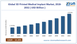 October, 7, 2025, New York--Zion Market Researchによると、世界の3Dプリント医療用インプラント市場規模は、2023年に約21億9000万ドル、2024-2032にCAGR 13.20%で拡大し、2032年までに約65億9000万ドルに成長する見込である。