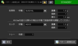 金属の種類、造形物の最大厚み、重量、数量 セッタ(炉内で造形物を載せる板)の材種、重量、枚数などを入力することで、最適な熱処理の時間・温度・圧力などが算出され、それ以上の設定無しで熱処理を開始できる。